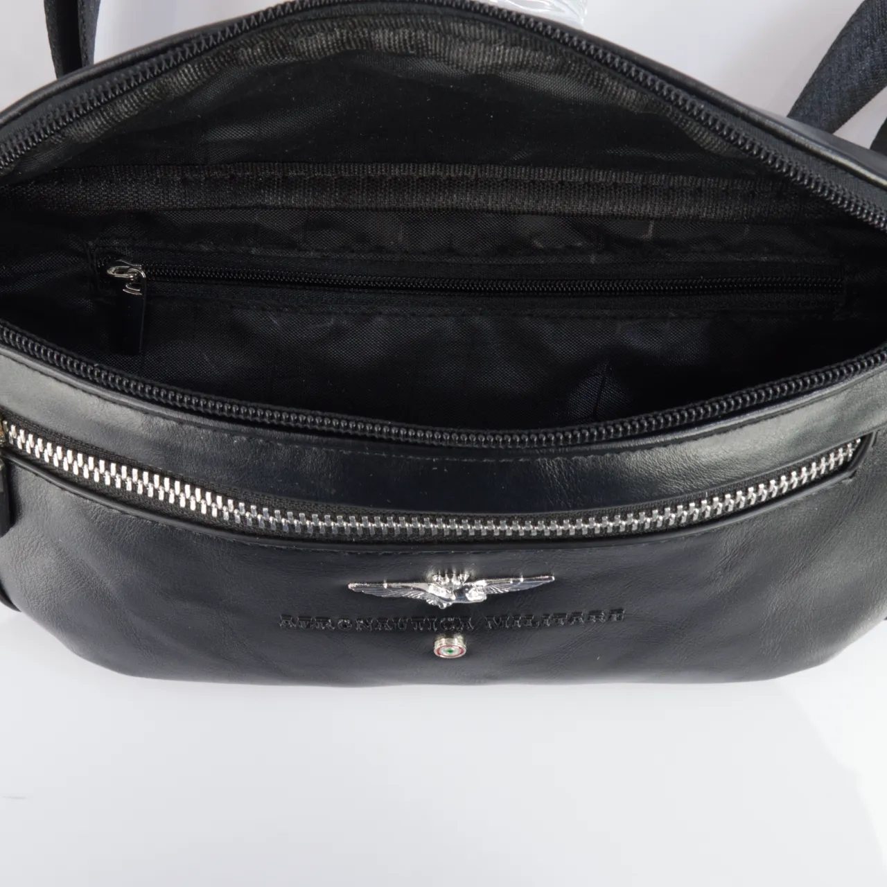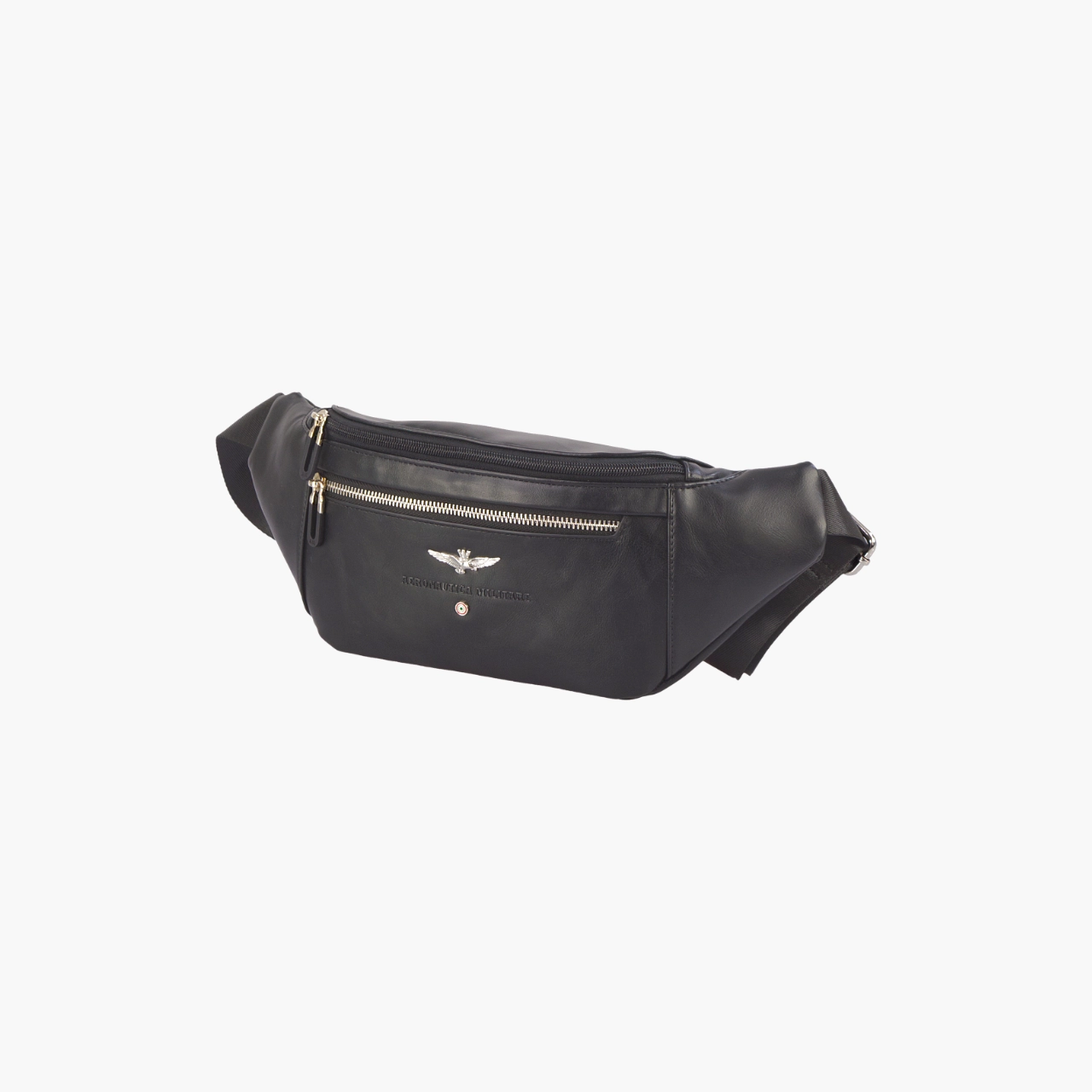Marsupio con zip interna. Questo prodotto presenta dettagli curati, come zip in metallo argentato per un tocco di brillantezza e il logo con un’aquila stilizzata, accompagnato dalla scritta e dal simbolo che richiamano un’estetica di ispirazione militare. Il design minimalista è arricchito da linee pulite e colori sobri come il blu e il nero, ideali per un look versatile e adatto sia a contesti casual che più formali.