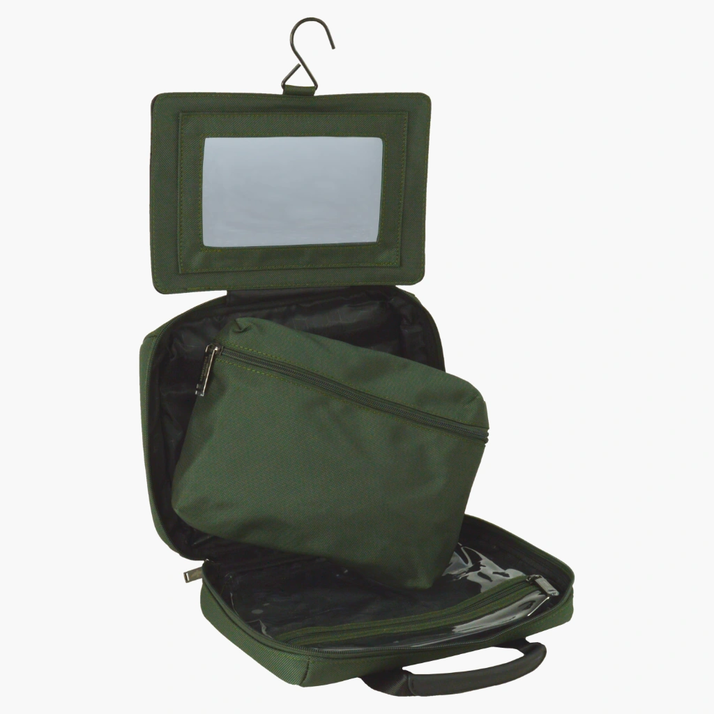 È dotata di una cerniera che si apre completamente per consentire un facile accesso all’interno, nel quale troviamo una pochette estraibile e uno specchio con gancio.
