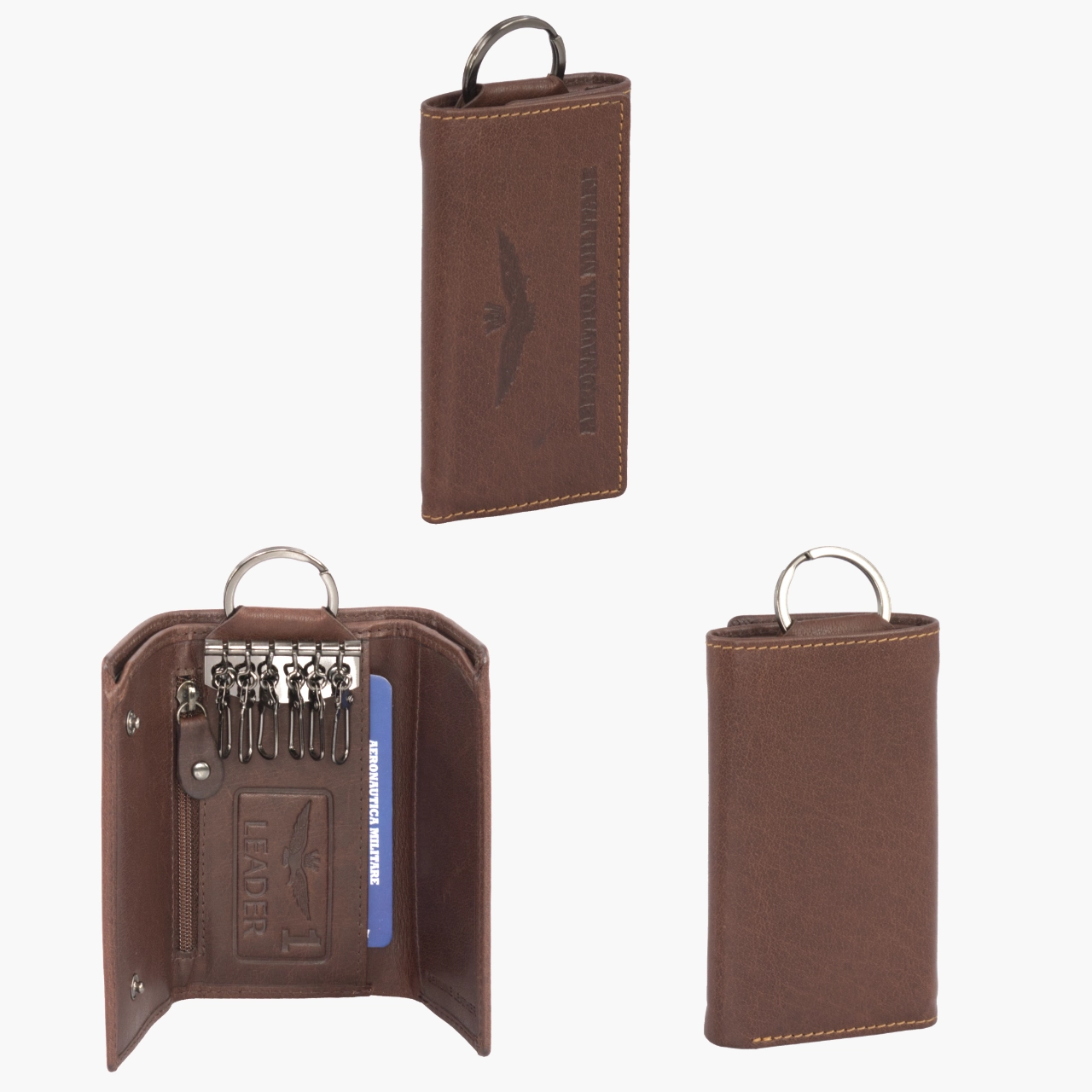 Portachiavi verticale con zip interna, realizzato in pelle di alta qualità con un effetto vintage. Questo portachiavi Aeronautica Militare della linea New Eagle è l’accessorio ideale per chi cerca classe e praticità. Sul fronte spicca il logo alato del brand, impresso a rilievo per un tocco distintivo e raffinato.