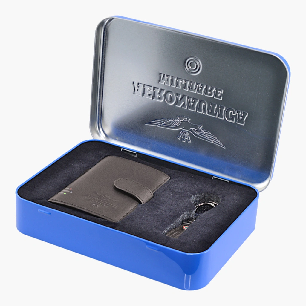 Un elegante scatola in metallo che cattura immediatamente l’attenzione grazie all’emblema distintivo dell’Aeronautica Militare.
