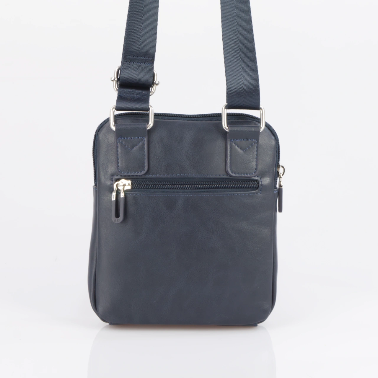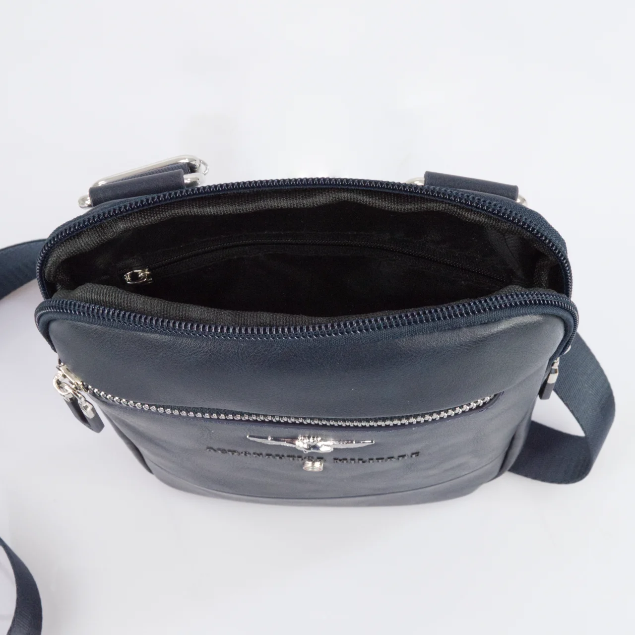 Tracolla con zip interna e posteriore. Questo prodotto presenta dettagli curati, come zip in metallo argentato per un tocco di brillantezza e il logo con un’aquila stilizzata, accompagnato dalla scritta e dal simbolo che richiamano un’estetica di ispirazione militare. Il design minimalista è arricchito da linee pulite e colori sobri come il blu e il nero, ideali per un look versatile e adatto sia a contesti casual che più formali.